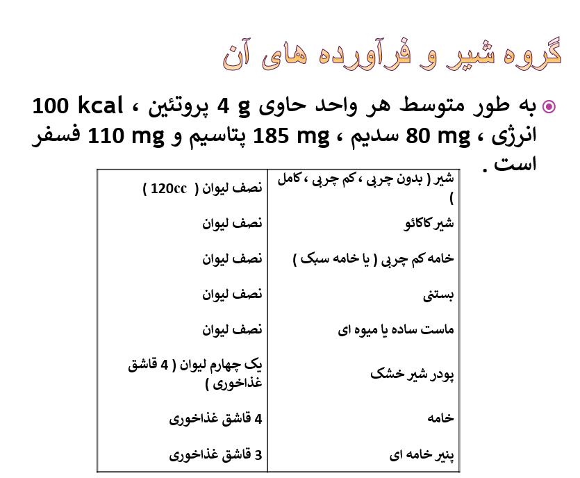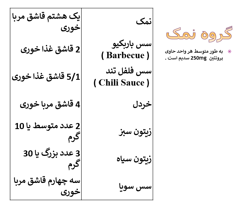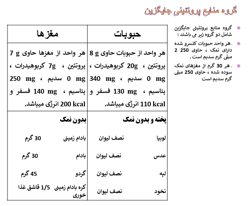 ۷ گرم از ۵۰ گرم از یکعدد تخم مرغ تامین میشود و ۴۳ گرم باقیمانده از ۶ واحد گوشت یعنی ۱۸۰ گرم گوشت تامین میگردد