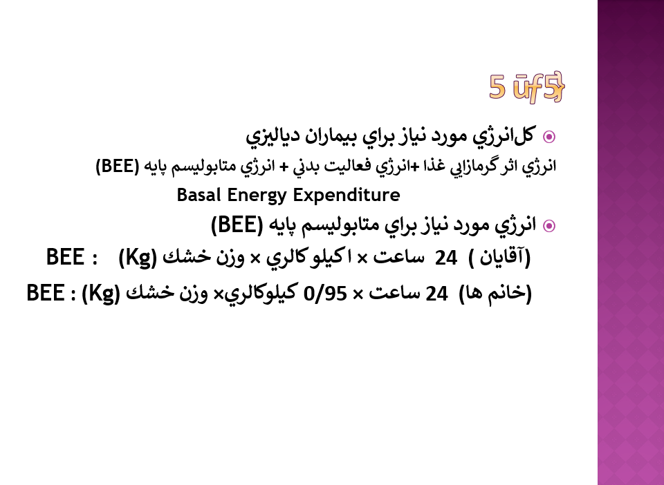 رژیم غذایی یک بیمار مرد ۵۰ ساله دیالیزی با وزن فعلی ۶۰ کیلوگرم و وزن ایده آل ۷۰ کیلوگرم