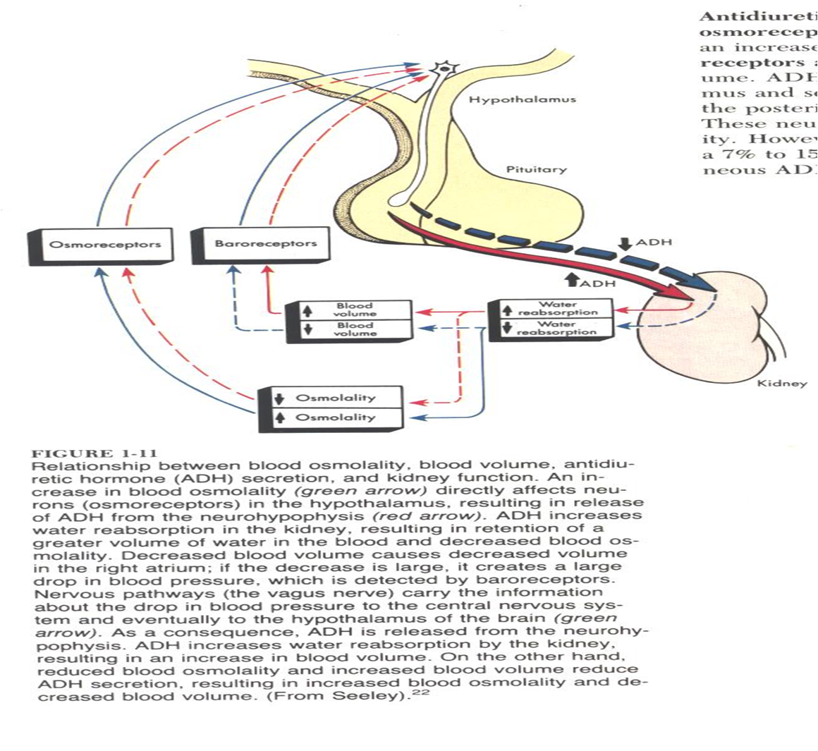 با توجه به اینکه کلیه یکی از مهمترین ارگانهای حفظ هموستاز بدن به شمار میروند و یکی از مهمترین عوامل حفظ تعادل در بدن تنظیم حجم مایعات و الکترولیتها می باشد،کلیه ها با مکانیزم های بسیار دقیق این امر مهم را انجام میدهند.از این رو در قسمتهای مختلف بارو رسپتورها و کیمیو رسپتورهای وجود دارد که مرتبا میزان حجم مایعات والکترولیتها را رصد کرده و کنترل می نمایند.که با فعال شدن هر کدام از این مراکز فعل و انفعالات بسیار دقیق در بدن اتفاق می افتد.