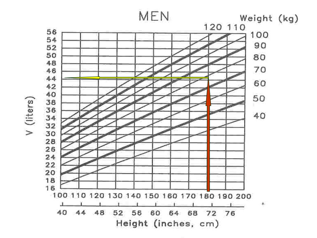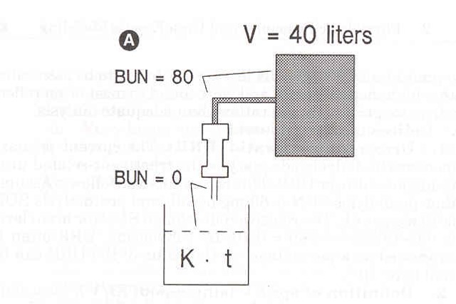 با توجه به نمودار ، حجم توزیعی اوره در این بیمار: ۴۶لیتر یا ۴۶۰۰۰ میلی لیتر است