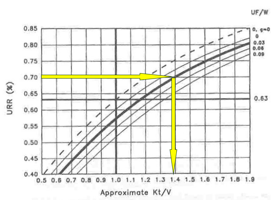 جهت بررسی کفایت دیالیز گرفته شده نیاز به محاسبه نسبت اوره گرفته شده به اوره اولیه بیمار می باشد به عنوان مثال اگر اوره بیمار قبل از دیالیز mg/dl00 1 باشد و پس از دیالیز به mg/dl35 برسد یعنی ۶۵ % آن برداشته شود و این معادل KT/V حدوداً ۱/۲می باشد