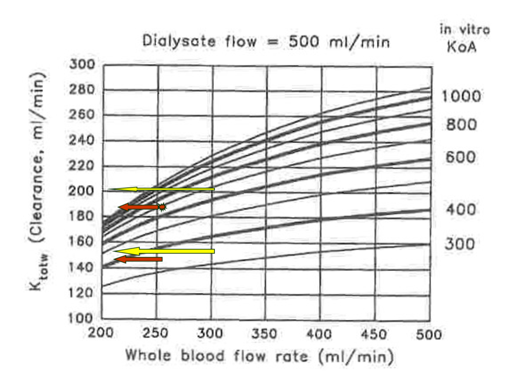 و اگر همین بیمار را با صافی R6 دیالیز کنیم که KOA حدود ۶۰۰ دارد. کلیرانس اوره با همان شرایط بالا برابر با ۱۹۵ میلی لیتر در دقیقه خواهد بود. که زمان لازم برای رسیدن به ۳/1KT/V= حدود ۳۰۰ دقیقه و یا معادل ۵ ساعت خواهد بود.