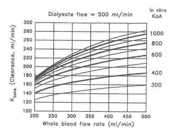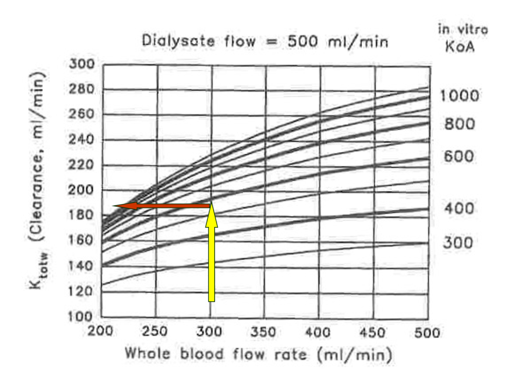 در صورتی که بخواهیم از صافی R5 استفاده کنیم که KOA برابر با ۵۰۰ دارد و میزان جریان خون یا BFR حدود 300ml/min انتخاب کنیم میزان کلیرانس صافی برای اوره در این شرایط 180ml/min خواهد بود
